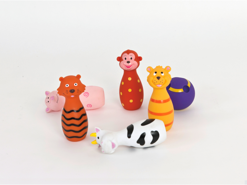 Roztomilá sada pěti kuželek ve tvaru zvířátek a koule s otvory jako