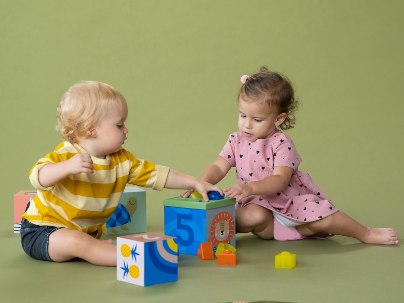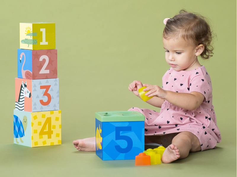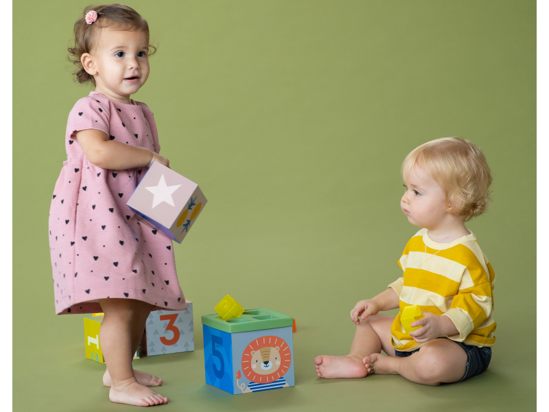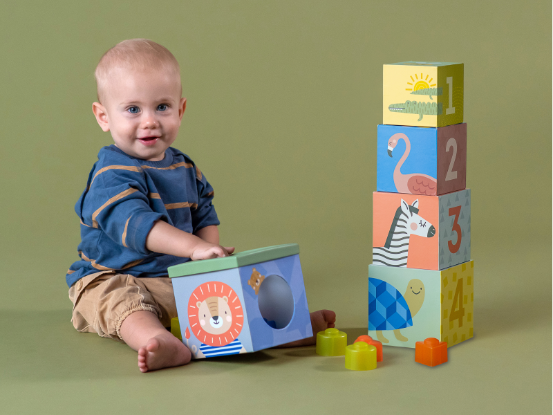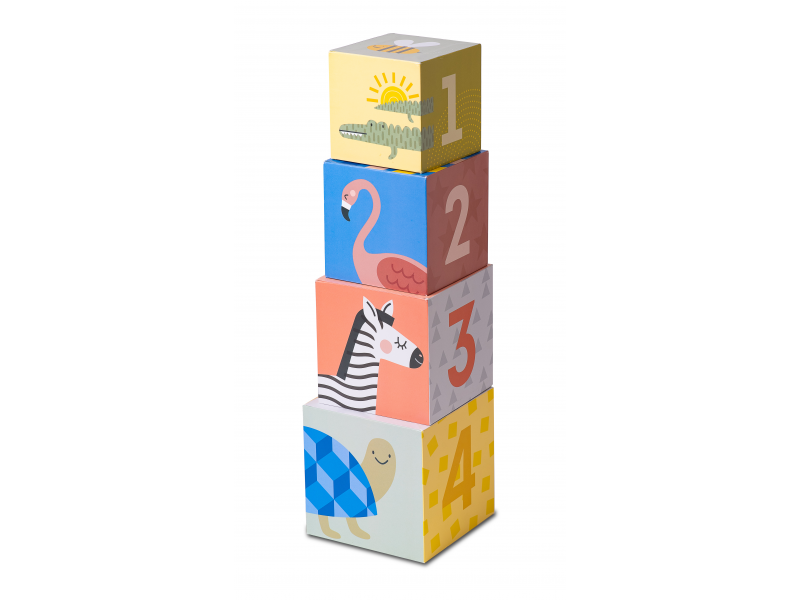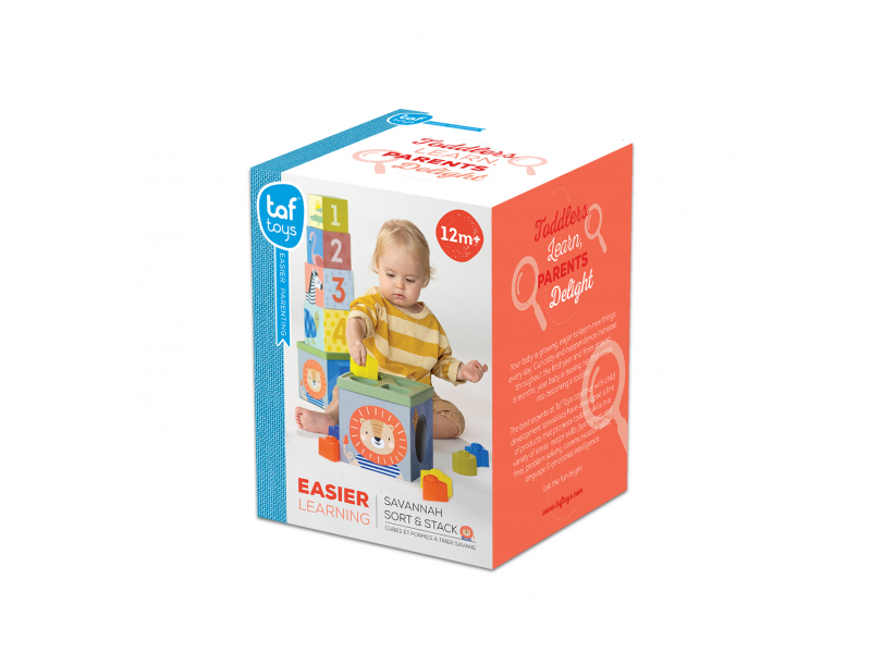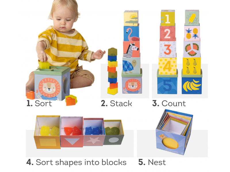 Sada kostek a tvarů v krásném provedení s roztomilými ilustracemi zvířat žijících v savanách nabízí variabilní způsoby hraní i učení pro vaše dítě. jednotlivé kostky dítě může skládat na sebe do tvaru věže i vkládat jednu do druhé dle velikosti 8 různobarevných tvarů se dítě učí vkládat do správných otvorů v největší kostce nebo do jednotlivých kostek dle barvy či tvaru spolu s rodičem se dítě s pomocí hračky může postupně učit barvy, tvary, velikosti, názvy zvířátek i první čísla Hračka rozvíjí jemnou i hrubou motoriku, koordinaci ruka-oko a jednotlivé smysly dítěte. Zároveň podporuje rozvoj dovedností pro řešení problémů. Sada obsahuje 5 kostek a 8 různobarevných tvarů. Rozměr velké kostky: 13.5 x 13,5 x 13,5 cm Vhodné pro děti od 12 měsíců.