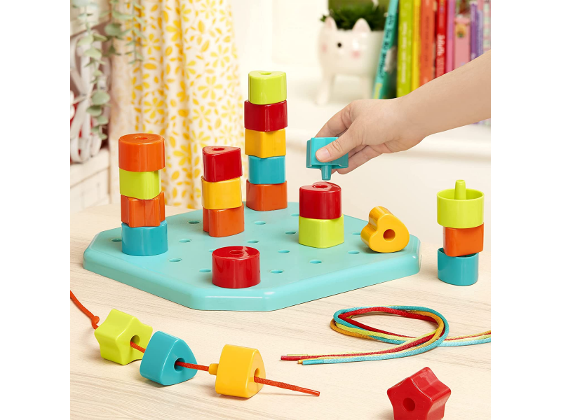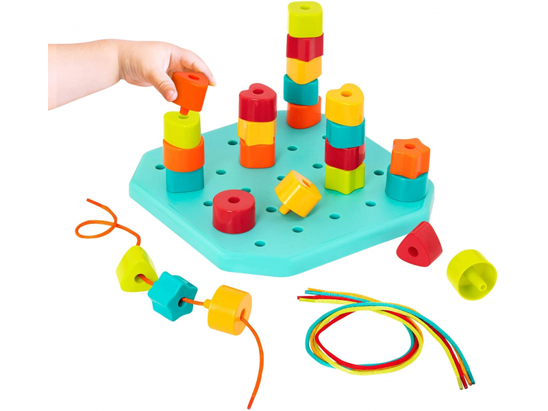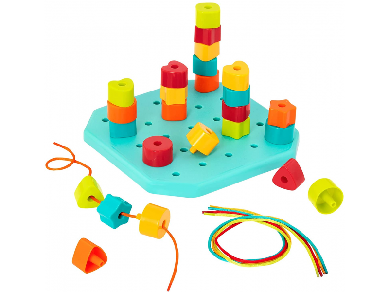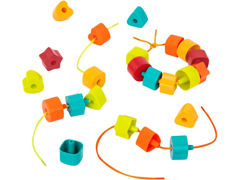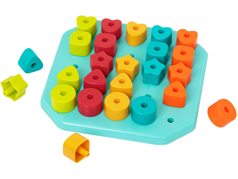 Hračka s barevnými navlékacími tvary nabízí mnoho variant pro hravé učení dítěte. Barevné korálky ve tvaru srdce, hvězdy, trojúhelníku, kruhu a čtverce je možné navlékat na šňůrku či skládat na desce s otvory do výšky. Dítě může korálky i šňůrky třídit podle tvarů nebo barev. Ve starším věku můžete s pomocí hračky učit dítě počítat. Hračka pomáhá rozvíjet kreativitu a jemnou motoriku dítěte. Sada obsahuje desku s otvory, 25 barevných tvarů a 5 šňůrek. Vhodné pro děti od 2 let.
